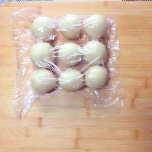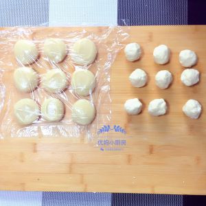 将油皮和水油皮分成九等份。为防止风干要全程盖好保鲜膜。