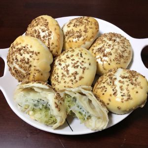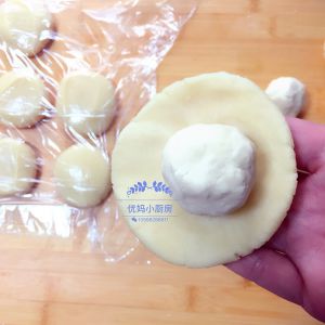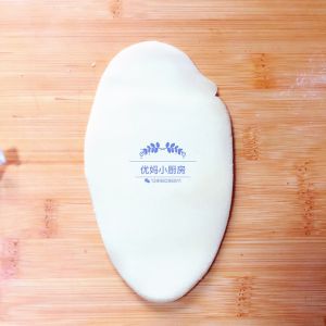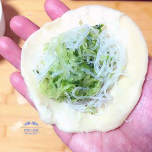 取一份擀成饼皮,放入馅料,像包馅饼那样,包好后口朝下。