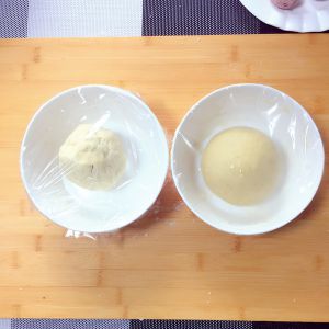 将面合成稍微软一点的面团后盖上保鲜膜, 饧上二十分钟;