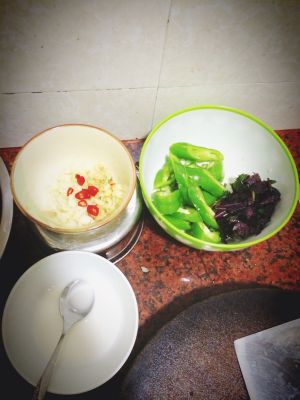 花甲吐沙的时间将蒜头,姜和指天椒切碎,青辣椒斜刀切,紫苏切碎,生粉加水搅成生粉水