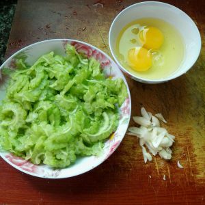 1. 准备好苦瓜、水发香菇、鸡蛋、洋葱、蒜。