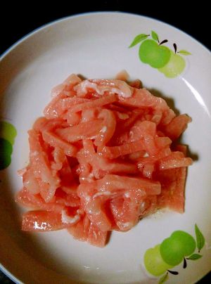 猪外脊肉切成丝,加一点蛋清和淀粉抓匀,这样会让肉质嫩并且不粘锅。