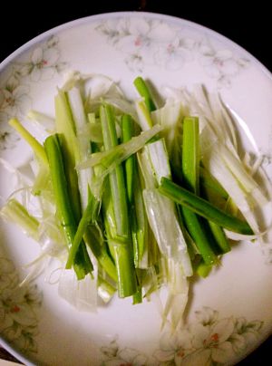 把猪里脊肉切成丝,锅里放肉热了下葱花呛锅,然后把肉放进去,肉变色后放料酒,水,焖一会,至肉熟了