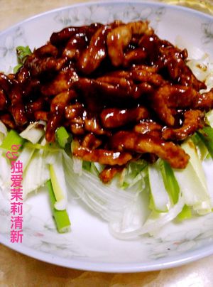 锅里放一点油,放甜面酱,加一点糖调味,加一点料酒,因为酱会很干,但千万不能倒水,否则成品菜会出汤。然后加鸡精,把肉丝放进去搅拌均匀盛出在葱丝上。