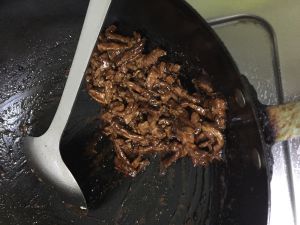 锅中加油适量,凉油时加入甜面酱,加热后加入浸泡葱姜的水,不要倒入葱姜,然后搅拌加热至冒泡后加入肉丝,再加入一勺糖,翻炒至汤汁收干关火