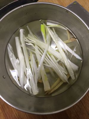 葱、姜切片切丝,放一碗内加少量清水,泡成葱姜水。