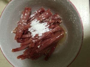 把甜面酱放碗里放上香油和糖,蒸上15分钟。把瘦肉切成丝放点鸡蛋清和粉面腌制15分钟。