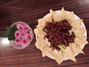 把腌好的肉放锅里炒熟后把甜面酱到进去,收汁。在盘里放上切好的葱丝和豆腐皮。大功告成了,和饭店的一样好吃
