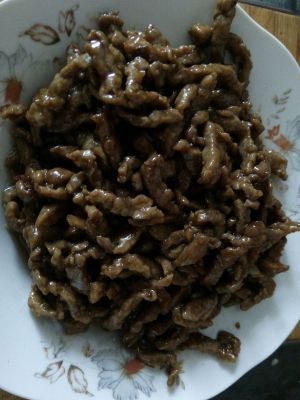 锅上放油,小火,放甜面酱炒一下把煸好的肉丝放入锅内翻炒,知道所有的肉丝均匀的粘上甜面酱为止,