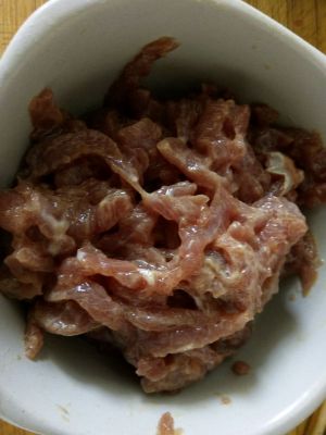 里脊肉切丝,然后放盐,酱油,淀粉,鸡蛋清抓匀,腌制好(可以把里脊肉稍微冻一下,这样会比较好切)