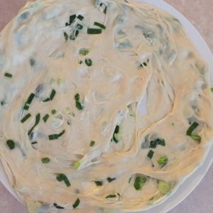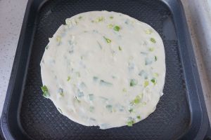 锅内加入适量油,开中火倒入面糊转动锅,均匀用锅铲摊平。