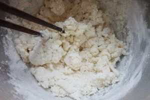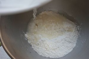 把面粉和玉米面粉混合加入开水烫熟搅匀。