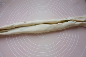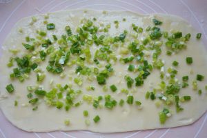 面粉,鸡蛋,水,或成面团。醒半小时,分成小面团,擀成饼,抹一层油,撒盐、葱。从一边开始卷起,卷成长筒然后团成盘中形状。