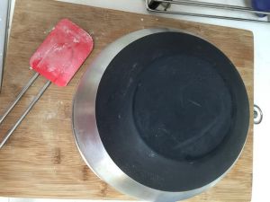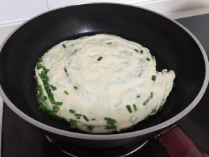 把薄饼放入已经预热的不粘锅内烘制即可,记得在热锅时放少许油,葱油饼自己本身也会出油。