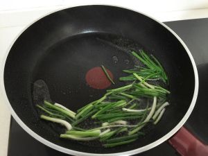 不粘锅内加入两勺橄榄油,放入事先准备好的葱段,小火熬制,炸至葱段金黄后挑出,留葱油备用。家里还有少量猪油,于是也加了进去,希望可以给葱油饼增加香气。