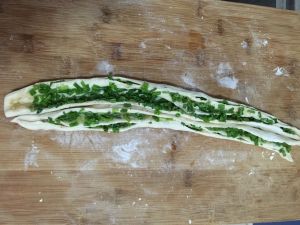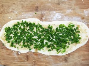 取一块已静置的面团,擀成长方形,抹上油酥,撒上葱花!做到这里突然很有成就感,感觉和外面卖的已经形似啦哈哈