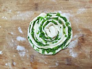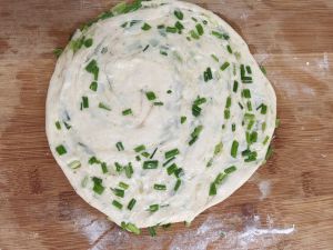 分别在面皮上撒入青葱,三个面皮重叠起来,擀成一块饼。