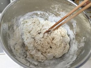 有一定温度的热水冲进面粉中,不断用筷子搅拌成絮状。建议水反复多次加入,这样比较好拿捏分量,面粉不用很湿。
