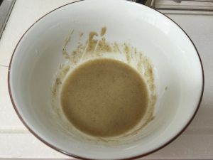 8克中粉倒入碗里,锅中葱段捞起,热油倒入面粉中,快速搅拌,油酥就做好了。