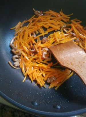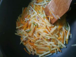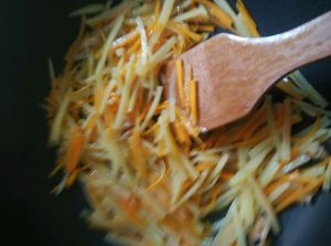 锅中油烧热放入肉丝,炒至变色加入胡萝卜丝翻炒至六成熟。