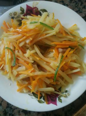 成品~素炒三丝高调亮相。橙绿黄搭配,色泽鲜艳,营养美味,看着很诱人哦