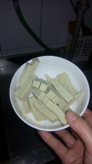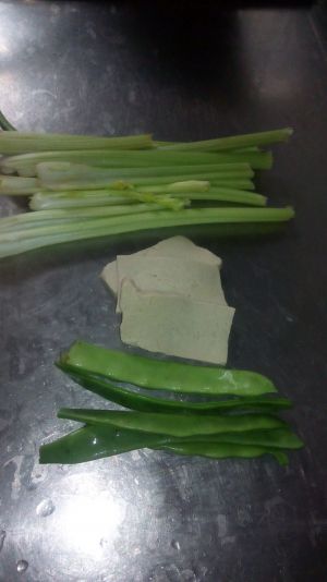 热锅凉油,少许花椒翻炒,加入芹菜和豆角加盐味极鲜,最后放入豆腐,继续翻炒直至成熟。