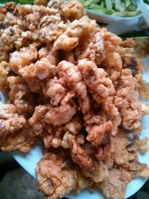 把肉片一片一片加入热油中(一定要小心 而且 肉一定要一片一片下 最后肉片颜色才好看) 等到肉变成金黄色就捞起