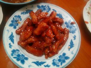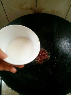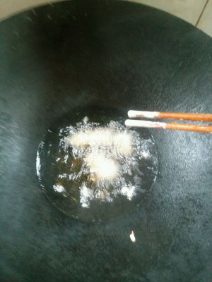 调汁:放醋、糖、水淀粉、葱姜蒜沫。