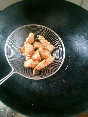 锅中放稍多点油,好糊的肉条炸至表面金黄色捞出。