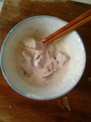 将玉米淀粉、面粉、蛋清加少量水加点盐,调成面糊,不要太稀。