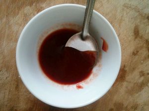 把番茄酱、白糖、醋混合在一起。番茄酱跟白糖多一点,醋别太多