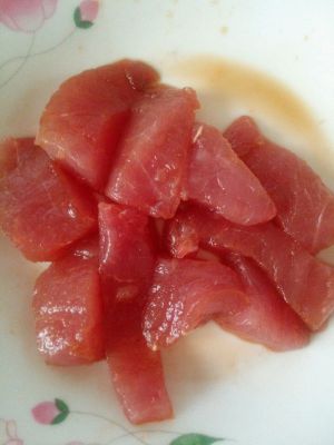 里脊肉切成条,然后用少量的醋、酱油、盐、料酒腌渍半小时。这些的用料都不要多了!