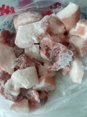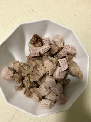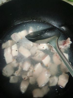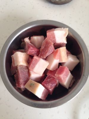 五花肉和排骨切块,热水焯两遍。第一遍肉放冷水锅中,煮开焯水一遍;第二遍热水直接焯水一遍。备用。
