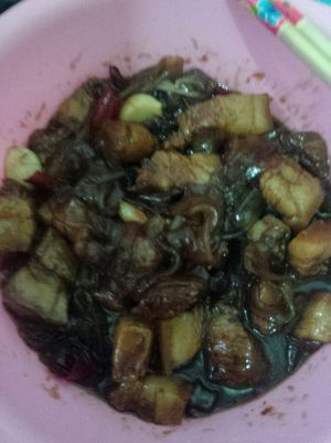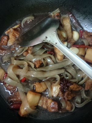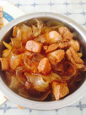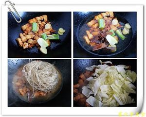 白糖适量熬成红色倒入猪肉、翻炒后加入水炖煮,再加入宽粉炖熟