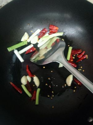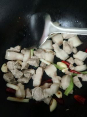 热油下五花肉煎至肉半熟变色,下干辣椒段翻炒