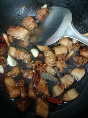 放入葱段、姜片、花椒、大料、桂皮、酱油,翻炒几下,加入水,没过五花肉。炖30分钟。