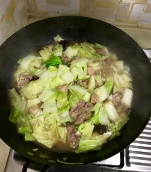 这段忘记拍了。 步骤如下: 热锅放油,姜蒜盐入锅; 排骨和五花肉放入煸炒2-3分钟; 料酒生抽,放白菜煸炒2-3分钟; 放盐,加热水适量略没过菜; 煮一会,放粉条,小火炖20-30分钟; 之后大火收汁出锅!
