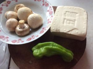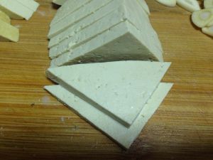 老豆腐切成1cm左右的三角形,胡萝卜切薄片,青椒切片,蒜切片待用