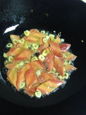 锅中留少许油,放入蒜片爆香,放入胡萝卜片煸炒2分钟左右(我这次的油放的稍微多了点)