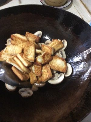 放入豆腐翻炒,翻炒至稍上焦色。