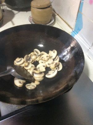 磨菇切片,先焯水,而后用油煸炒片刻。