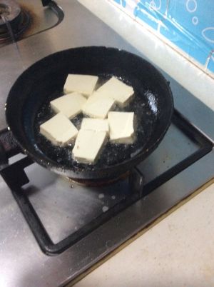 豆腐切块,锅中倒油烧热煎豆腐至金黄,放入葱蒜爆香!