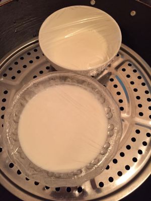 用保鲜膜封好奶碗。放入蒸锅。大中火