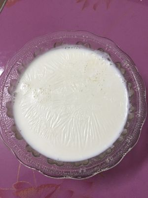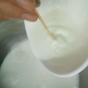 这时候牛奶应该结成了一层奶皮 用筷子将奶皮戳破 使牛奶溢到奶皮的上面 稍微留一点牛奶在碗里 防止奶皮粘在碗上 剩下的倒出在另一个碗里