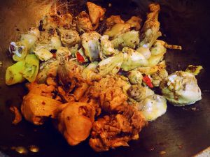 3,热锅到油多一点,把鸡肉和鸭胗到里面翻炒,一会儿再导入土豆片炒,感觉6/7成熟了,倒入葱姜蒜,香肠,洋葱,青椒,继续炒。