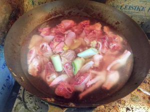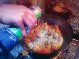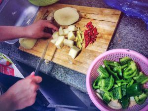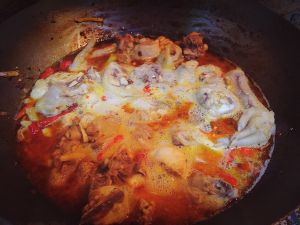 然后加入土豆熬煮。同时,煮水,准备煮面。鸡块已熟,土豆松软后,加入青椒,两分钟后关火即可。