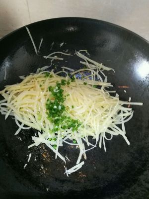 下葱翻炒 切记别炒太久 不然会失去土豆丝的爽脆口感