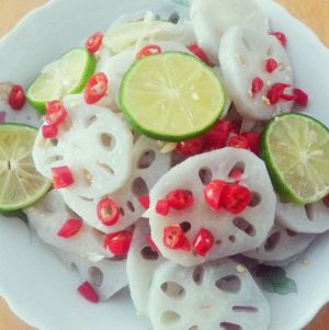 把藕盛出后,先放盐,柠檬汁,大蒜碎,味精,再放小米辣,柠檬片就可以了。不喜欢吃太酸的一个柠檬就够了,这里放了5个小米辣也是特别辣的,不能吃辣的放2个就可以了。接下来就可以美美的享受自己做的美食了,是不是棒棒哒,快行动起来吧 >O<