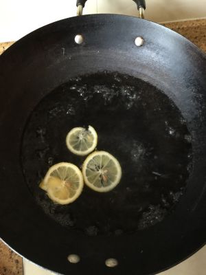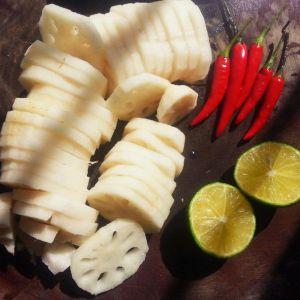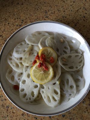 准备食材:①藕,切片,大约1cm的厚度 ②小米辣5个,切成圈 ③柠檬,2个,其中一个半挤作柠檬汁,另外半个切成片 ④大蒜半个,切碎(忘记照大蒜了)