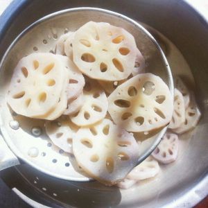 焯水过后,用漏勺捞起,迅速放入冷水中。一是可以让藕快速冷却,二是可以洗掉藕上面黏黏的东西。我过了两道冷水,有冰水更好。